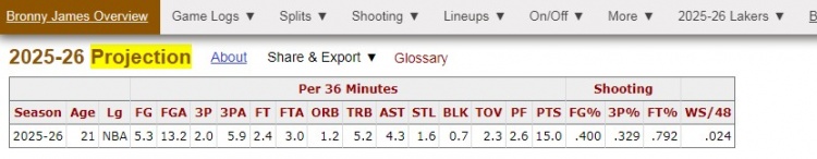 Trang web dữ liệu BBR dự đoán thống kê mùa giải mới của Bronny: 15,0 điểm, 5,2 rebounds và 4,3 kiến tạo mỗi 36 phút.